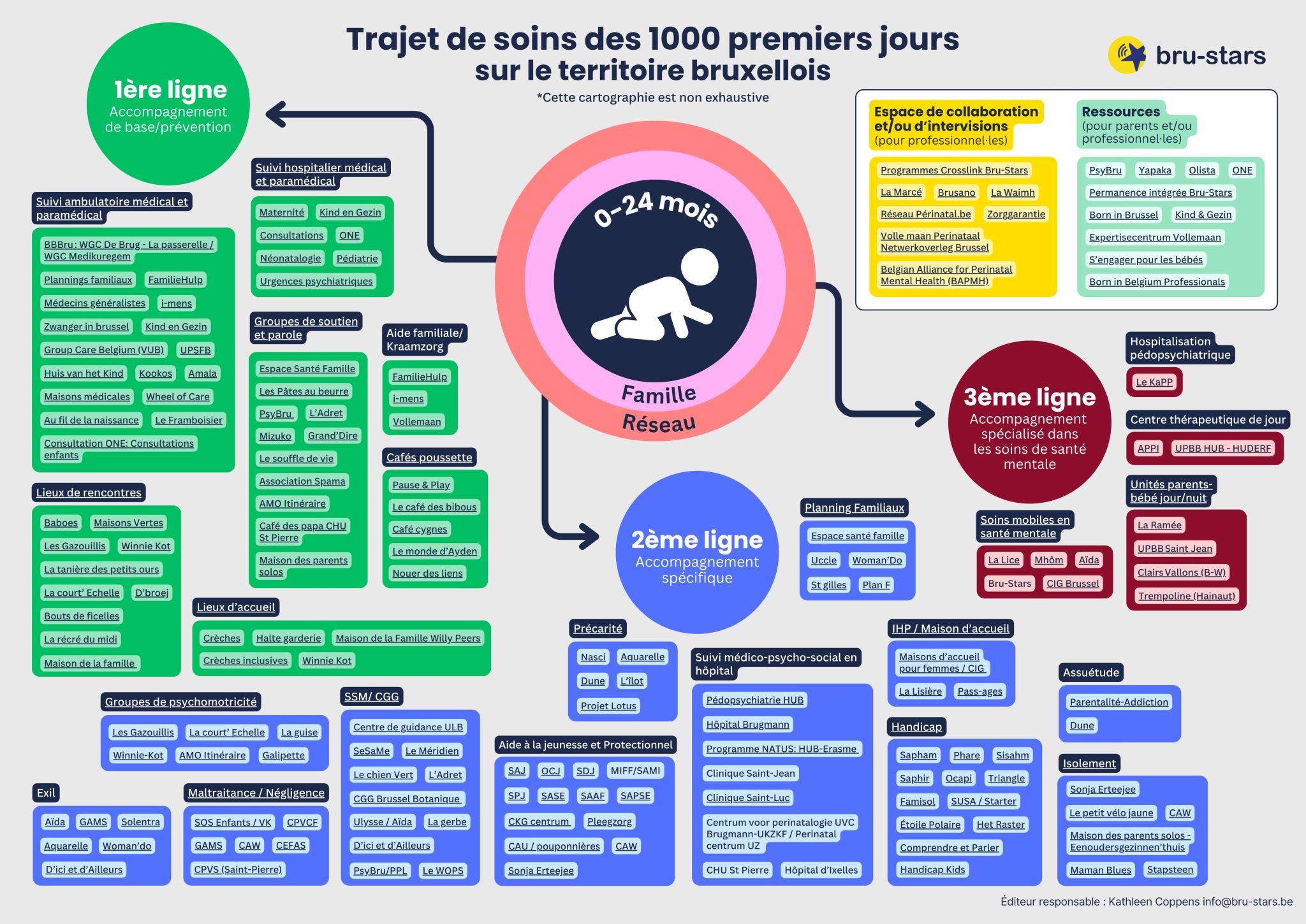 Comme le rappelle Bru-Stars sur son site : « Les rencontres organisées par le programme Crosslink 0-6 ans de Bru-stars ont permis d’élaborer ce projet. Nous tenons encore à remercier les participant·es aux divers groupes de travail pour leur implication et investissement. Cette cartographie du trajet de soin des 1000 premiers jours est donc créée par des professionnel·les, à destination des professionnel·les, et se présente comme un outil d’aide à l’orientation. Chaque service mentionné est en lien cliquable avec des fiches informatives rédigées et collectées sur la plateforme Born in Brussel ou vers des sites internet propres aux différentes institutions. En outre, cette cartographie à été réalisée selon le prisme de professionnel·les de terrain et est donc complémentaire à toute autre forme de répertoire du réseau de soin périnatal à Bruxelles. Loin d’être exhaustive, cette cartographie se veut évolutive grâce à l’apport constant des professionnel·les qui souhaiteraient y intégrer de nouveaux services. En ce sens, nous invitons les services à prendre contact avec nous. »