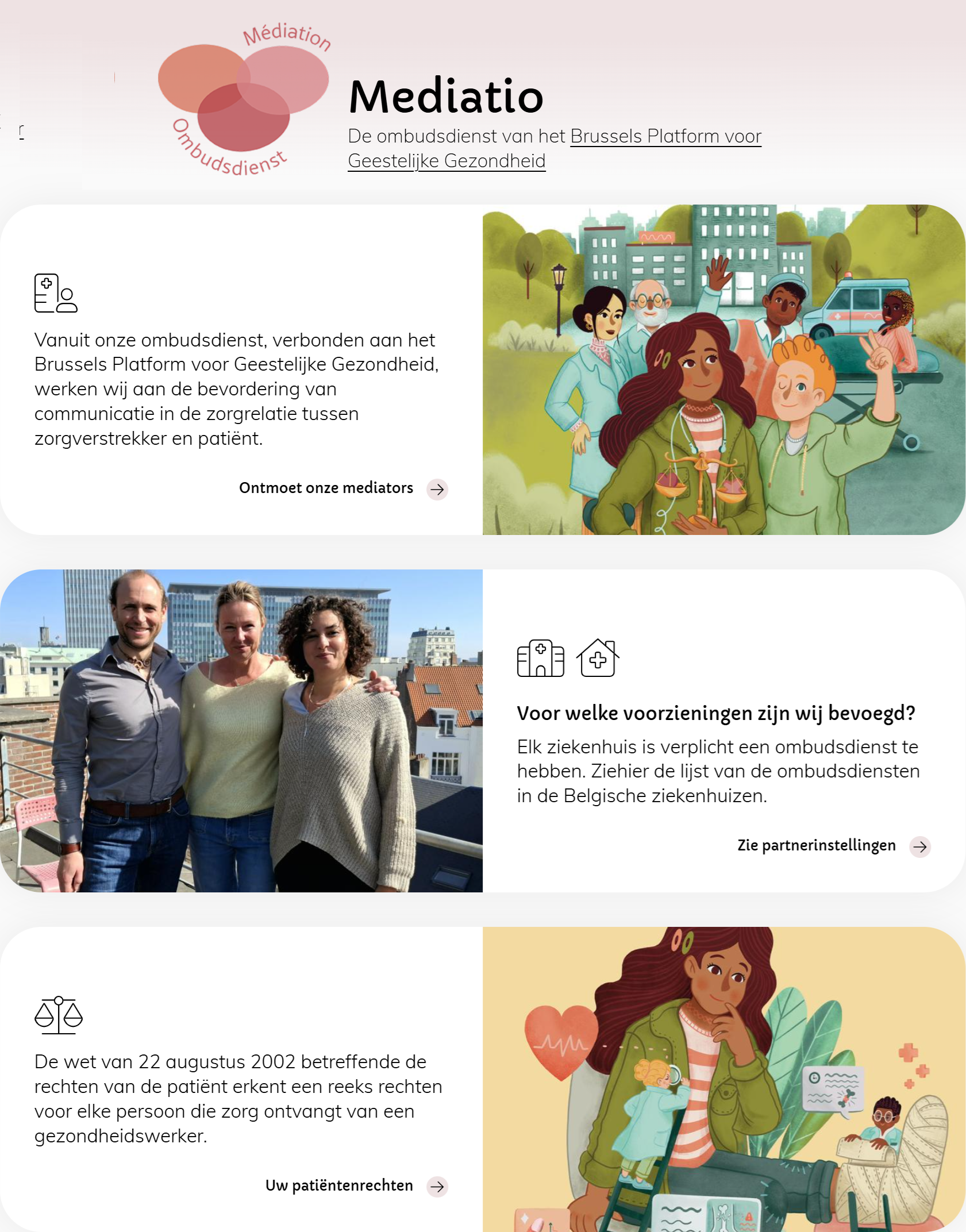 Om de zorgrelatie te versterken en de toepassing van deze rechten te bevorderen, kan de patiënt contact opnemen met de ombudsdienst. De bemiddelingsdienst van het Platform is bevoegd voor bepaalde psychiatrische en geestelijke gezondheidsinstellingen op het Brusselse grondgebied.