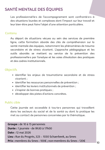 Inschrijvingen : https://smes.be/fr/sante-mentale-des-equipes/
